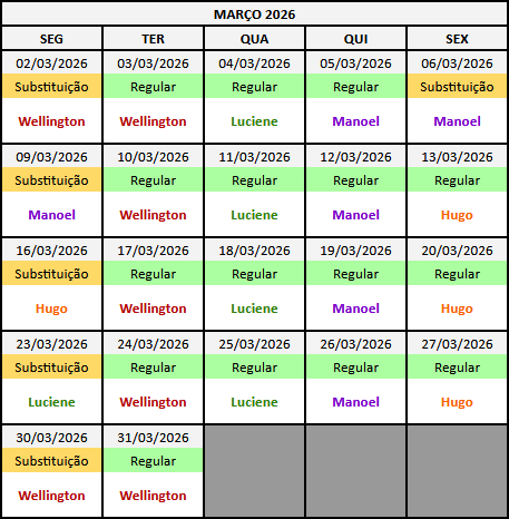 De 05/01 a 20/02: Terças e Quintas, das 12h30 às 16h30